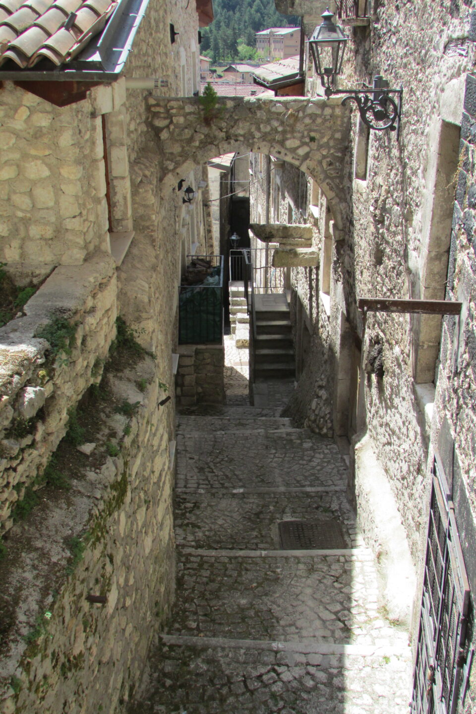 La casa è aperta ed entriamo, al primo piano c’è il museo di arti e tradizioni popolari, mentre al secondo piano c’è un’esposizione di opere dello scultore di Campo di Giove Liborio Pensa. Scendiamo ancora, tra archi e vie coperte fino a intersecarci con una lunga e ripida scalinata che scende dal belvedere in cima al paese.