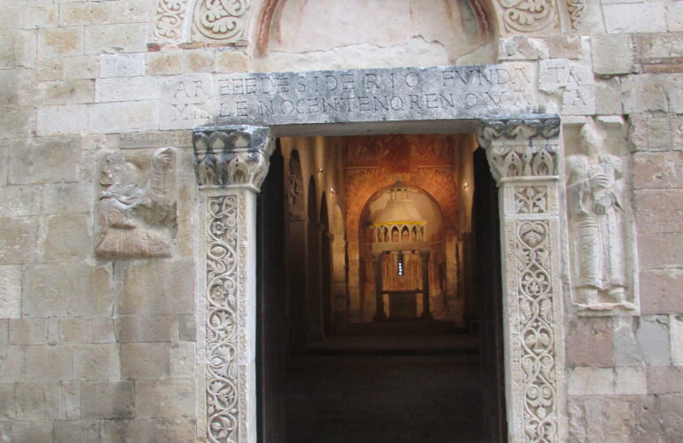 L’interno della chiesa è splendido, vi è presente anche un bel ciborio duecentesco e alle spalle sull’abside centrale un grande affresco raffigurante Cristo in trono tra gli Evangelisti.